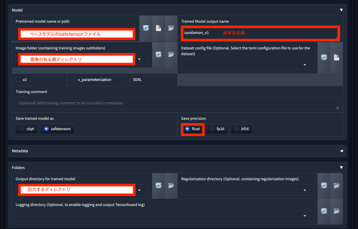 特に重要なのが、 FP16 or BF16を使うか?という質問だと思う。 noを選んだことをよく覚えておく。